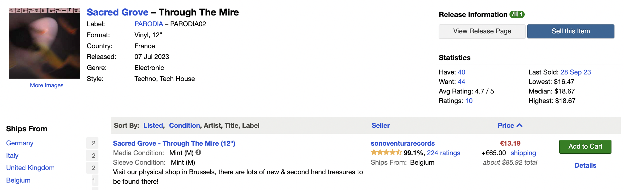 Each listing has a grading for media condition, sleeve condition, and seller comments. The marketplace relies on a trust system, where the seller’s reputation depends on accurate grading of their records.